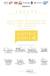 Am Dienstag, 23.09.2025, wurde das Carl-Severing-Berufskolleg für Metall- und Elektrotechnik der Stadt Bielefeld im Rahmen einer feierlichen Veranstaltung im Heinz-Nixdorf-Museumsforum in Paderborn mit dem Titel „Digitale Schule“ ausgezeichnet. Die Ehrung gehört zur Initiative „MINT Zukunft schaffen!“, die unter der Schirmherrschaft von Bundeskanzler Friedrich Merz steht. Insgesamt wurden über 200 Schulen in NRW für ihre herausragenden Bemühungen im Bereich der digitalen Bildung geehrt.