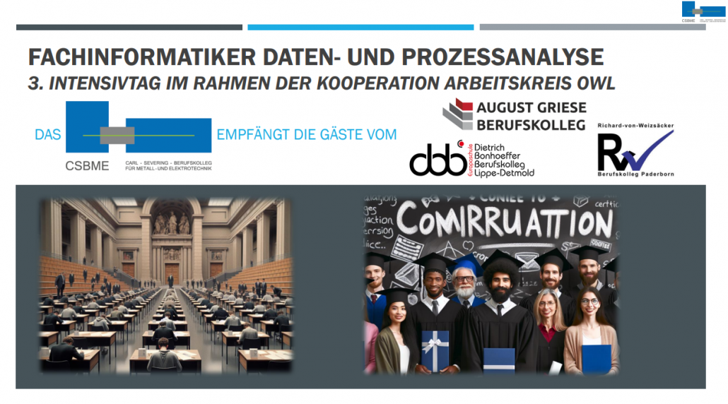 Bereits zu Beginn des Schuljahres fanden zwei weitere Intensivtage im Rahmen unserer Kooperation „IT-Arbeitskreis OWL“ statt: Ein erster Workshop am August-Griese-Berufskolleg in Löhne vermittelte mathematische Grundlagen für maschinelles Lernen, während ein zweiter Tag am Dietrich-Bonhoeffer-Berufskolleg in Detmold die Themen Prozessmodellierung, -analyse und -optimierung in den Mittelpunkt stellte.