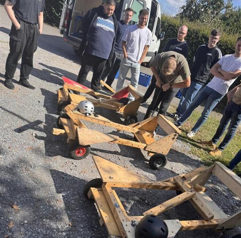 Nach einer kleinen Kaffeepause geht es dann weiter mit der Übung „Seifenkisten-Projekt“. Unsere Klasse wird in drei verschiedene Gruppen aufgeteilt und jede Gruppe soll am Ende das gleiche Auto präsentieren. Die Schwierigkeit: Nur unsere jeweiligen Teamleiter dürfen nur unter Zeitdruck an einem neutralen Ort miteinander kommunizieren, es dürfen keine Fotos oder Notizen gemacht werden und es gibt scheinbar unerschöpflich viele verschiedene Möglichkeiten, aus den gegebenen Materialien ein Fahrzeug mit den gewünschten Funktionen zu bauen. Ein Gruppe baut munter drauf los, eine andere wartet ab und wartet auf Anweisungen, die dritte Gruppe steht zunächst etwas ratlos vor der Aufgabe. Nach einigem Hin und Her finden wir eine gemeinsame Strategie, um Ende nahezu identisch aussehende Autos präsentieren zu können! Eine tolle Aufgabe, die sehr gut verdeutlicht, wie wichtig Kommunikation, Absprache und ein eine gemeinsame Teamstrategie sind.